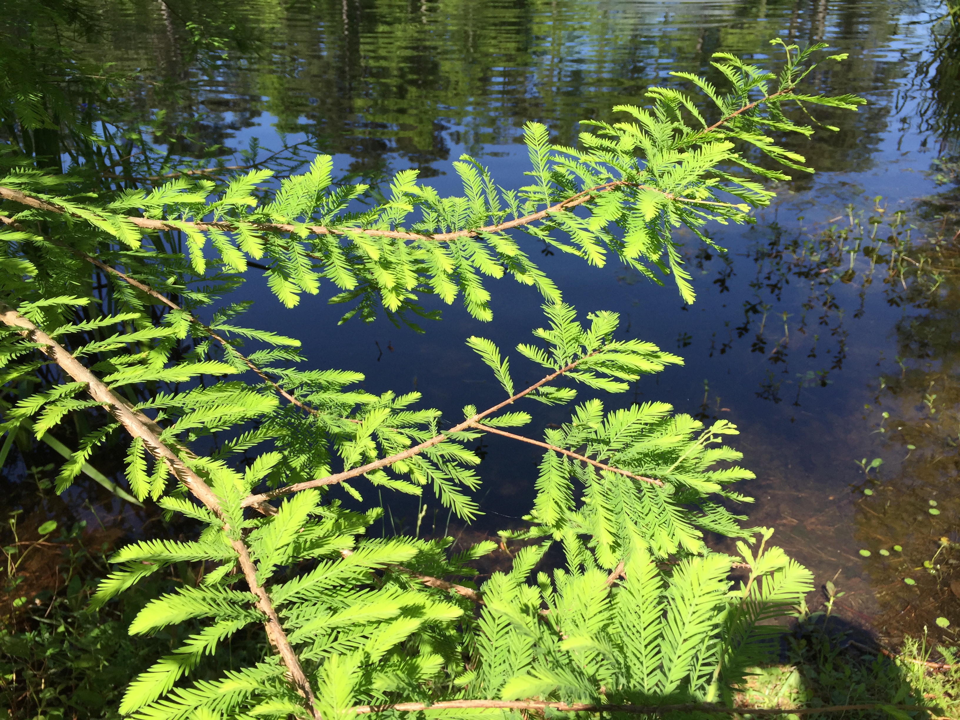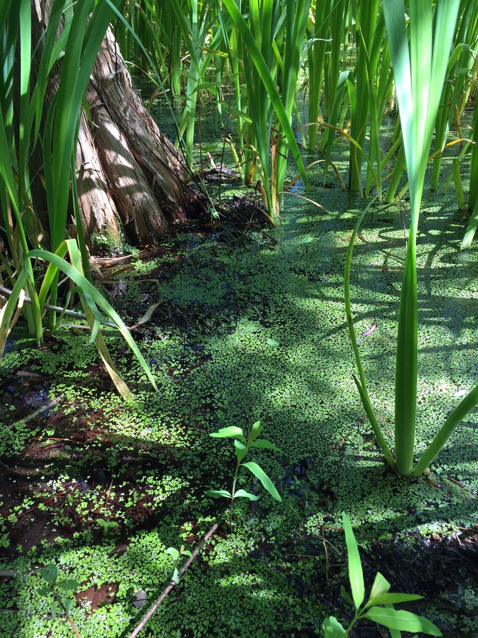 As I headed back to the starting point, to re-meet fellow walkers, I noticed a gathering of cypress knees on the rim of the pond. I got down on my own knees to look closer. Drawn to the variety of really green greens, I sat a while and noticed hundreds of small circular plants looking like confetti resting on the surface of a tiny stream of water. As I watched, I saw the stream move, first right for a spell, then return, in a rhythm of sorts. Over and over again. The moment had me. I began to breathe in time with the movement in front of me: inhale, pause, exhale, pause, repeat. I let the water’s movement guide the pace. It was prayer, “Breathe me in; Breathe me out.” Those few minutes, I knew what it meant to feel one with everything. Photo and reflection by Amy