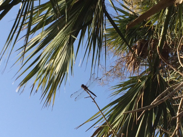 About to the spot where I entered, I stopped, stood still. I looked up and around me, listened to the deep silence, the distant breath of ocean waves. The first swallowtail of the morning paid a generous visit. I was all of it; it was all in me. I looked down at the sandy dirt. A neon green with black dragonfly landed on a leafy twig just beyond my left ankle. Leaving my camera in my pocket, I bowed to take in its magnificent form. A few minutes into this meeting, I noticed a yellow bee aiming for that bare ankle. It was abuzz, flying in slow motion, sideways and forward all at once. I remembered the caution not to run from a bee, and I didn’t want to kill it even if I could, so I just bent low, whispering, ‘please don’t bite.’ As I uttered this, the dragonfly launched itself, flying the inches between my ankle and the nearing bee. Intercepted, the bee veered off. I watched as the dragonfly flew out and around in a full circle, re-landing at its same place on the twig. Astonished, I asked myself, ‘Did I really see what just happened?’