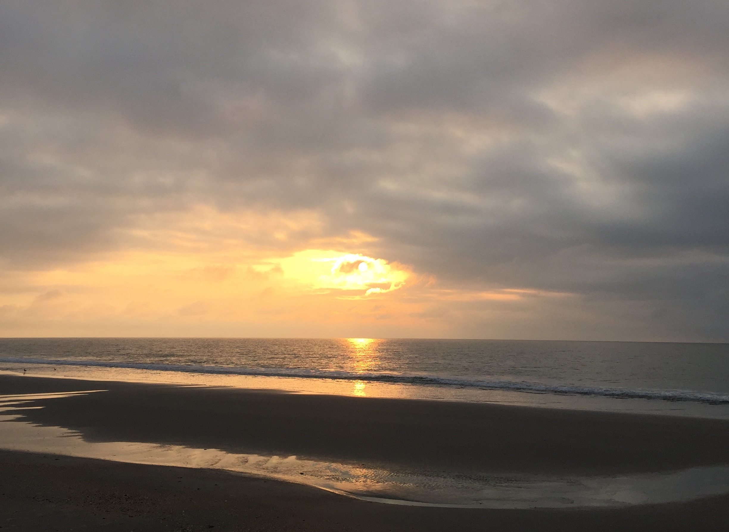 The morning was still and peaceful and my mind grew quiet as the light changed and the sun secretly rose behind the clouds. As we shared our thoughts and insights, the sky grew brighter and the sun created a pathway across the ocean. Photos and reflection by Nancy B.