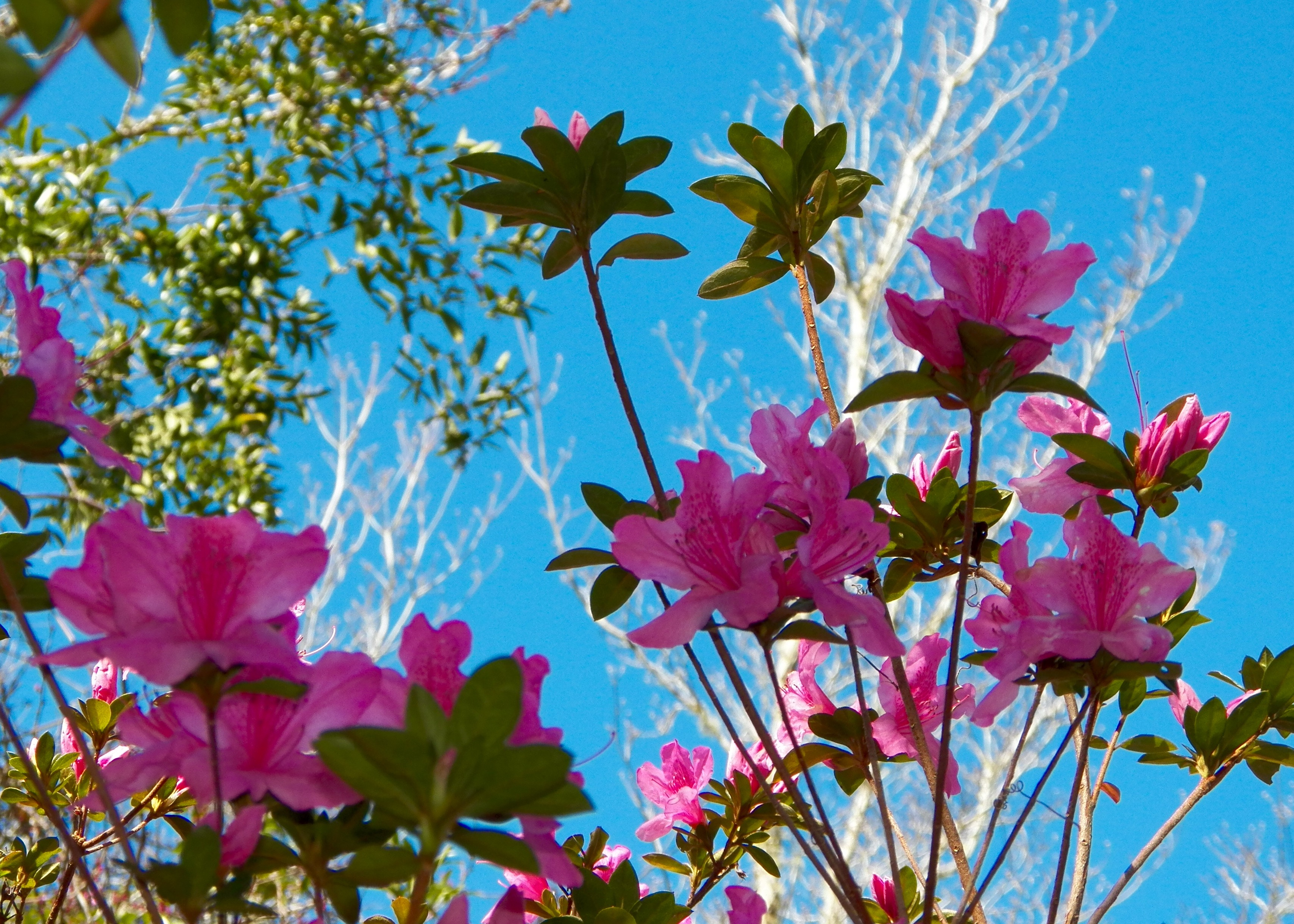 As I walked toward the gardens, the stark silhouette of the bare branches and Spanish moss against the brilliant blue sky spoke to me again of being both on the threshold from winter to spring, and the threshold of the now-place — certainly a moment of wonder and grace! As with the irises, the branches were ready to step over the threshold into spring as seen in the very small buds waiting to burst with new life.