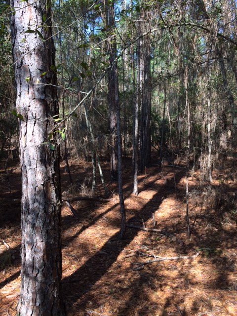 Woods open somewhat to ground pocked with low mounds of spongy moss, sandy-green, scratchy to the touch. As I walk through them, I am surprised by holes deep enough to swallow my foot, and old ruts to navigate with care.