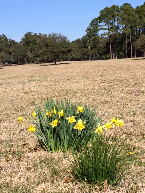 Just before I decide to make the turn back, the woods end, and a wide field fills my view. Live oaks on the horizon, only a cluster of fully opened daffodils close, dancing in the wind. For the first time ever I am moved to lie beside these yellow beauties, seeing from their vantage point how to welcome a day.