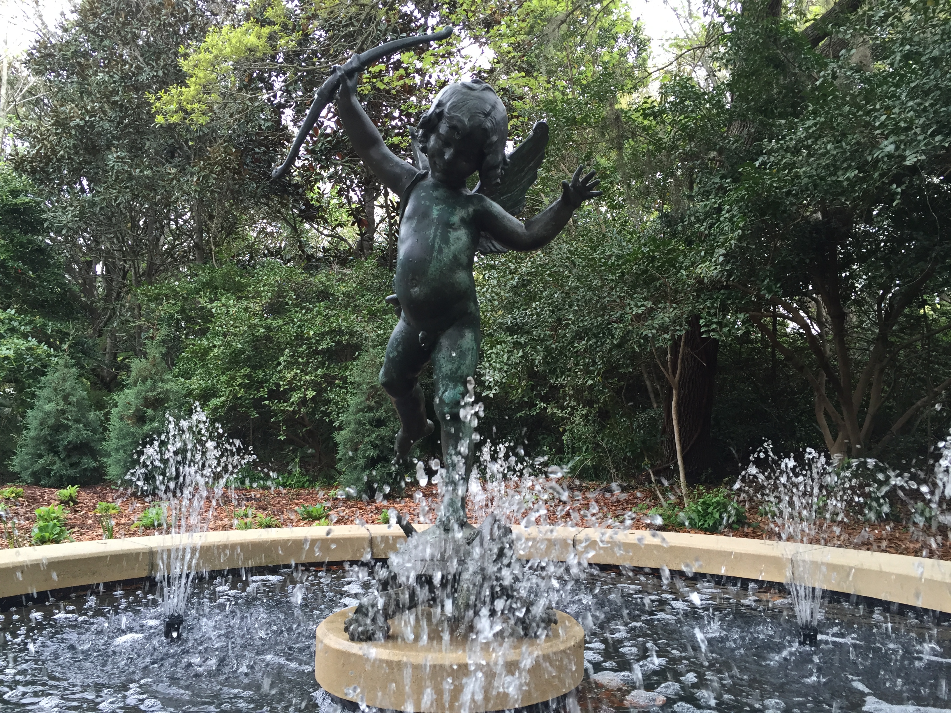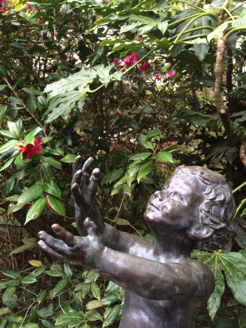 Hands cupped, open to receive, so beautifully sculpted as “Happiness” in the children’s garden. I stood and wondered how else I could be open like that child. And then I walked to the Muses, stood at the water’s edge, and a black-brown-orange butterfly landed on my abdomen, and stayed. I couldn’t, wouldn’t, move to get my camera. After minutes, it flew off and returned, lighting on my right shoulder, and stayed a while. I received its gentle touch as mercy; now, how might I land so unexpectedly, gently, in my offering the delight of mercy?