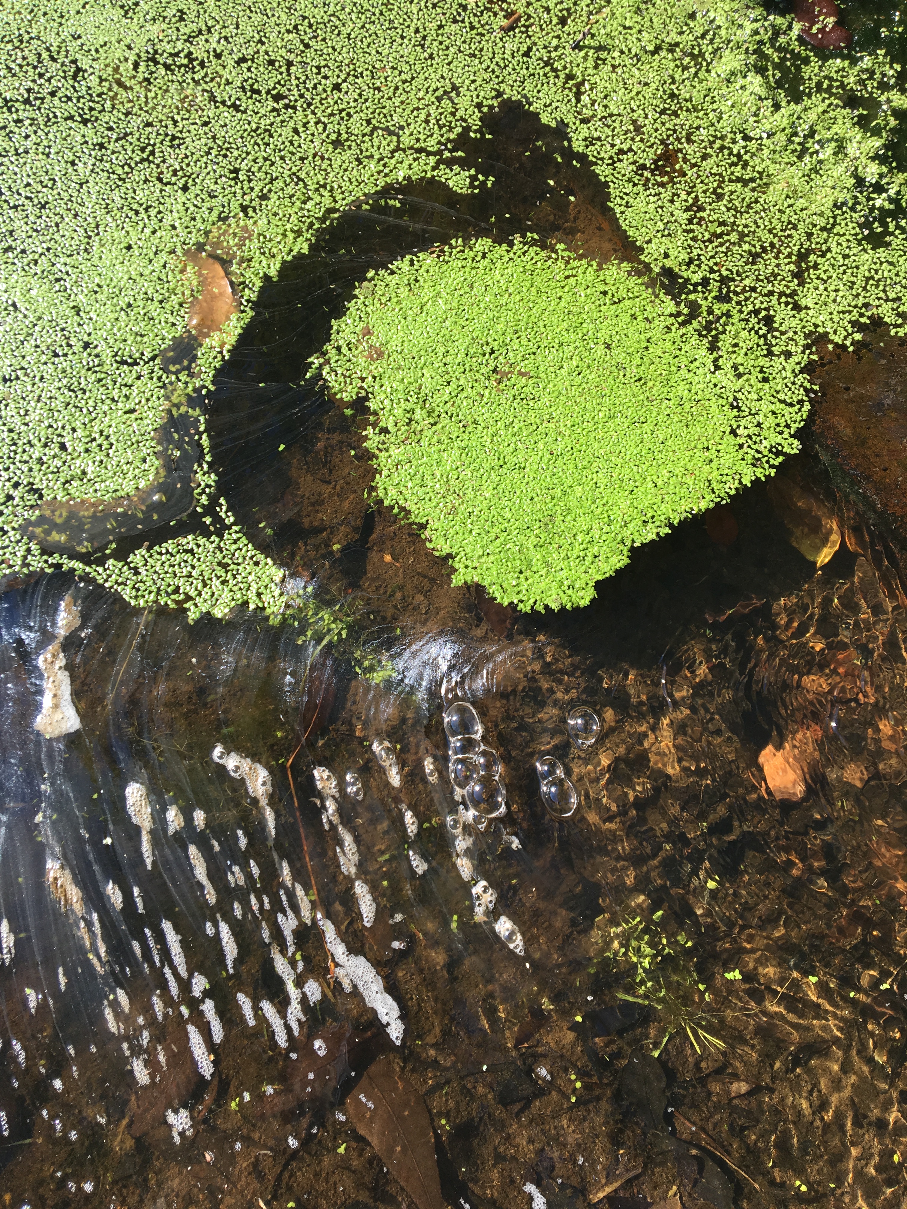 This picture mirrors the circles/rings image from the trees in the opening poem. I was fascinated by the bubbles that floated down from the waterfall and by the circle made by the water separating the algae.