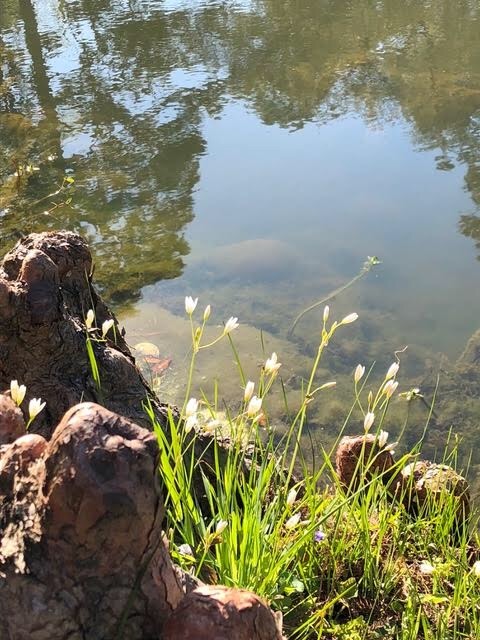 Just enough murk can obscure or reveal you have to stand still and look close: lone trout wiggles from the shoreline; tadpole class darts off to recess; lily pads the size of quarters sway atop their tethers; purplish violets giggle in the breeze. Holy, holy, holy.