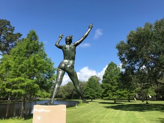 Glorious morning. Birds are singing from every direction. I wandered down to the pond opposite the camelia gardens finding such joy seeing the new green of the bald cypress. Then I see a sculpture of a nude woman with one step planted while the other one is in mid-air. Stepping out into this beautiful world, taking a chance, arms raised joyfully. Oh, how grateful and blessed I am.