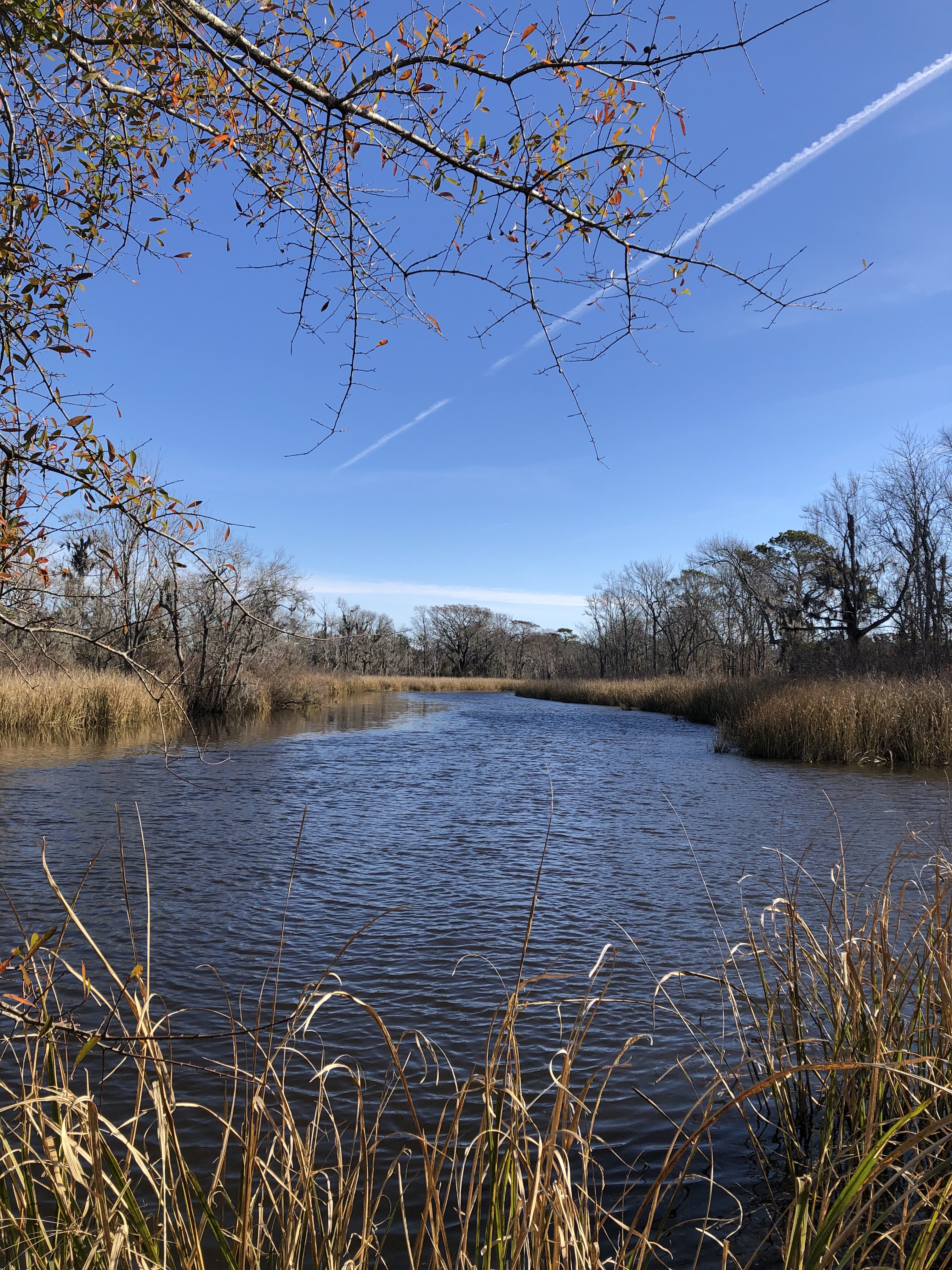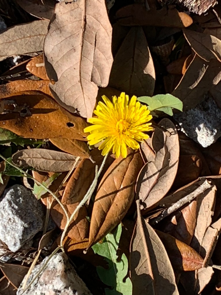 While walking today listening to the birds, I was thinking that the trees in Winter have a unique beauty with very little color. The oak covered in gray moss was very striking. In another area the reflections in the still water were so clear. Everything was quiet and calm. Just when I thought I would not see any color , I looked down and discovered one dandelion emerging from the brown leaves. Now that is joy!