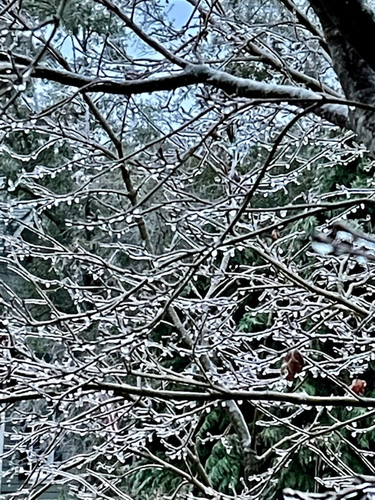 It was unfortunate that WiW was canceled for today, however the storm beat us, and safety first! I have taken this pause, and have decided to sit in the sun room that is about ten feet from our bird feeders and watch the activity, peer at the ice and just look out into the frozen world. The birds have food, I went out and made sure they had an ” unfrozen entree” of seeds and suet to eat. They are coming, slowly as they discover the bonanza. As I watch them and enjoy this pause, with books nearby, hot coffee, and my favorite worn out sweatshirt, I look out and watch this new beginning. The unfolding, the small renewal as the ice drips in the attempt to free the trees, bushes and plants. I think of the spiritual journey I am on, this journey that my wife and I share. This journey is like the unthawing of the ice, slowly, with deliberate drips. The drips of water as the leaves become free and can again bask in the sunshine, sprout new beginnings, and absorb nutrients. I too, as I become renewed and more knowledgeable, feel as if my spiritual education is my de-icing. Small beginnings in this quest, this journey to understand, and grasp the bigger picture that is out there. I took a photo recently that I will share of this tiny pine tree growing out of a hole in a live oak. I took it because it reminds me of myself. A small pine protected and cherished by this wonderful live oak. Like how God loves us, protects us, nurtures us, and encourages us in this journey of growth. I think of the times I was angry, before I came to understand He is always at our side. We, as humans in a fast paced world, especially in our society, want instant gratification. Yet, there are those slow drips of water, slowly but surely uncovering the trees as the ice dissipates. Revealing, that yes, indeed, we will flourish, and God is with us every single step of the way. My wife and I feel so blessed, being able to finally live here full time since her retirement, to share this beautiful place, to discover our mutual journey of spiritual growth, to have a church to call home. I am so grateful for her, my life, God and his incredible patience with me, and countless other things I consider blessings. So as the birds continue to come, I will enjoy this day no matter what it brings, because the ice is dripping!