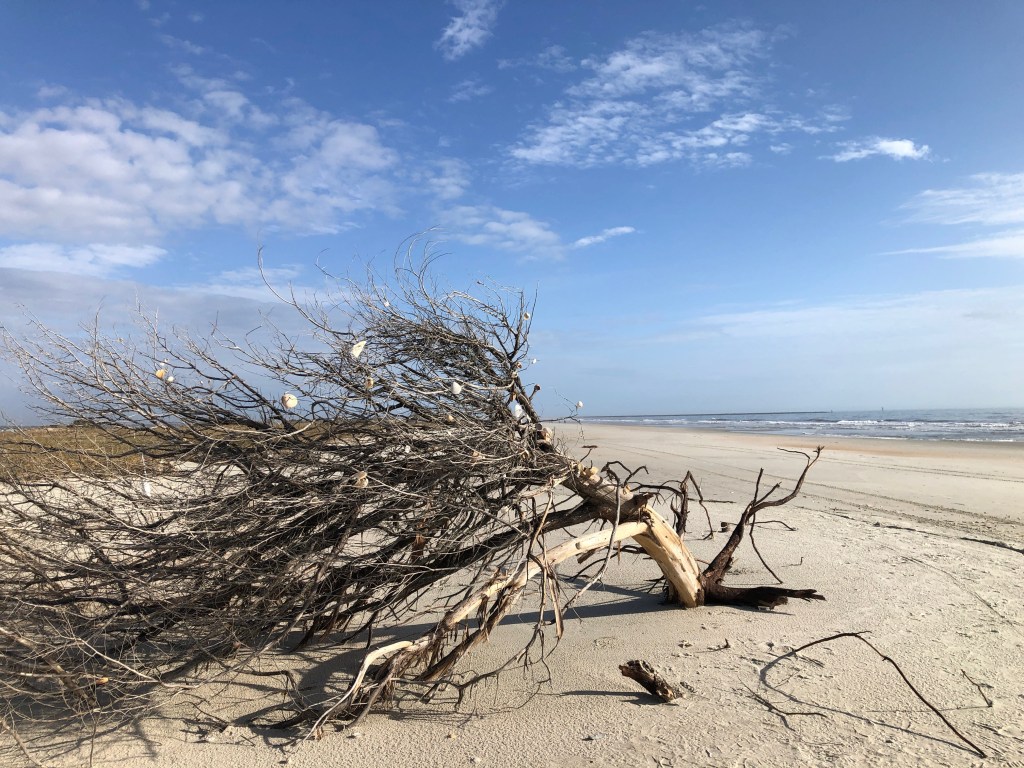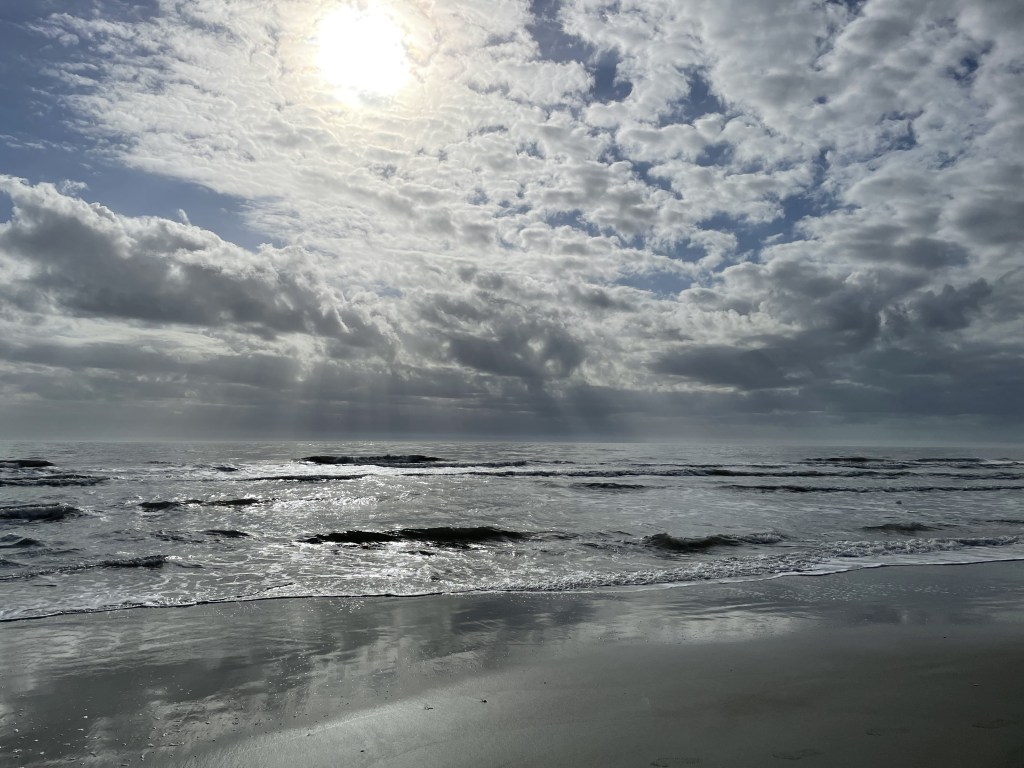“I walked this beach for the first time since Hurricane Ian’s impact. Ocean surges had clawed out the dunes, allowing the inner sandscape to reveal. Lots of parts of bushes remained standing, or bent. On the top of one bush, a bold egret perched. I walked toward it, closer, closer, and it stayed and watched me watch it. I thought of our reading today, about staying awhile, about being filled with light. And I thought how the whiteness of this bird became a source of light amidst the darkish surroundings. It made me ask myself, ‘What light will I add to this day?’ It matters that I do.”