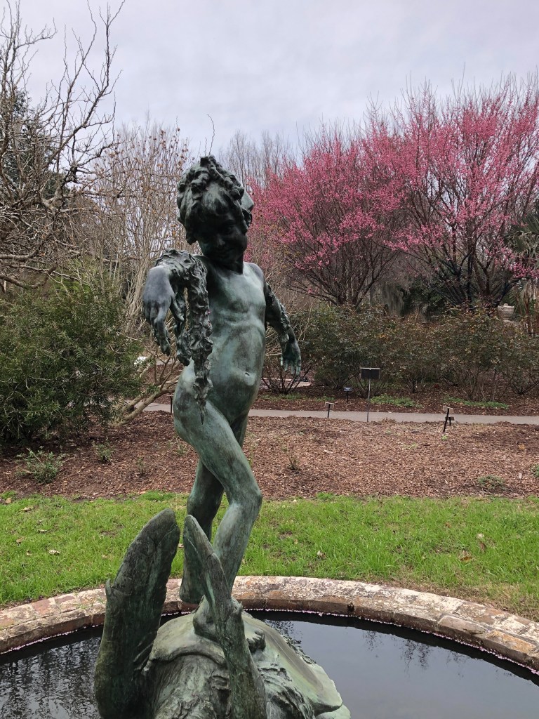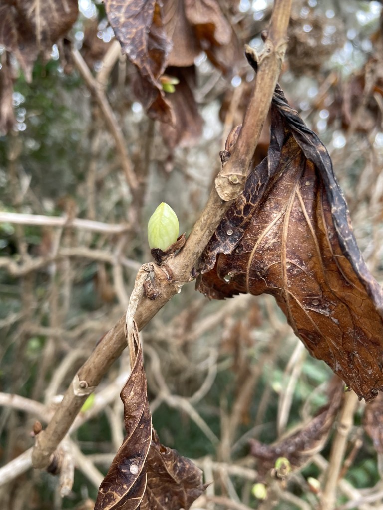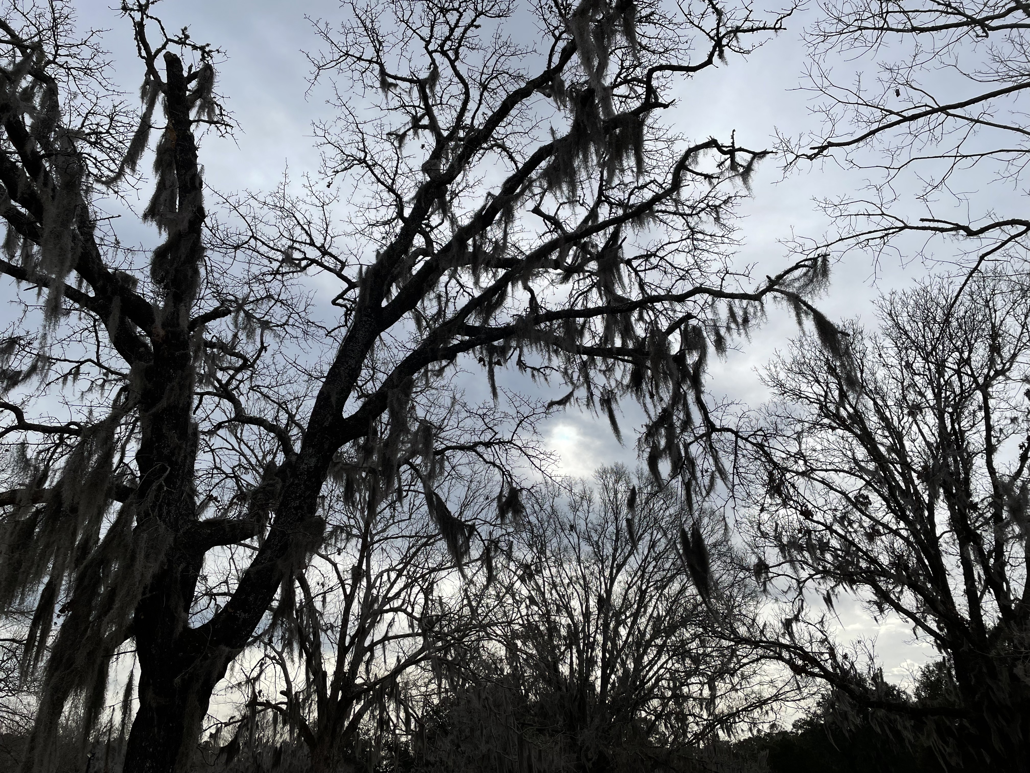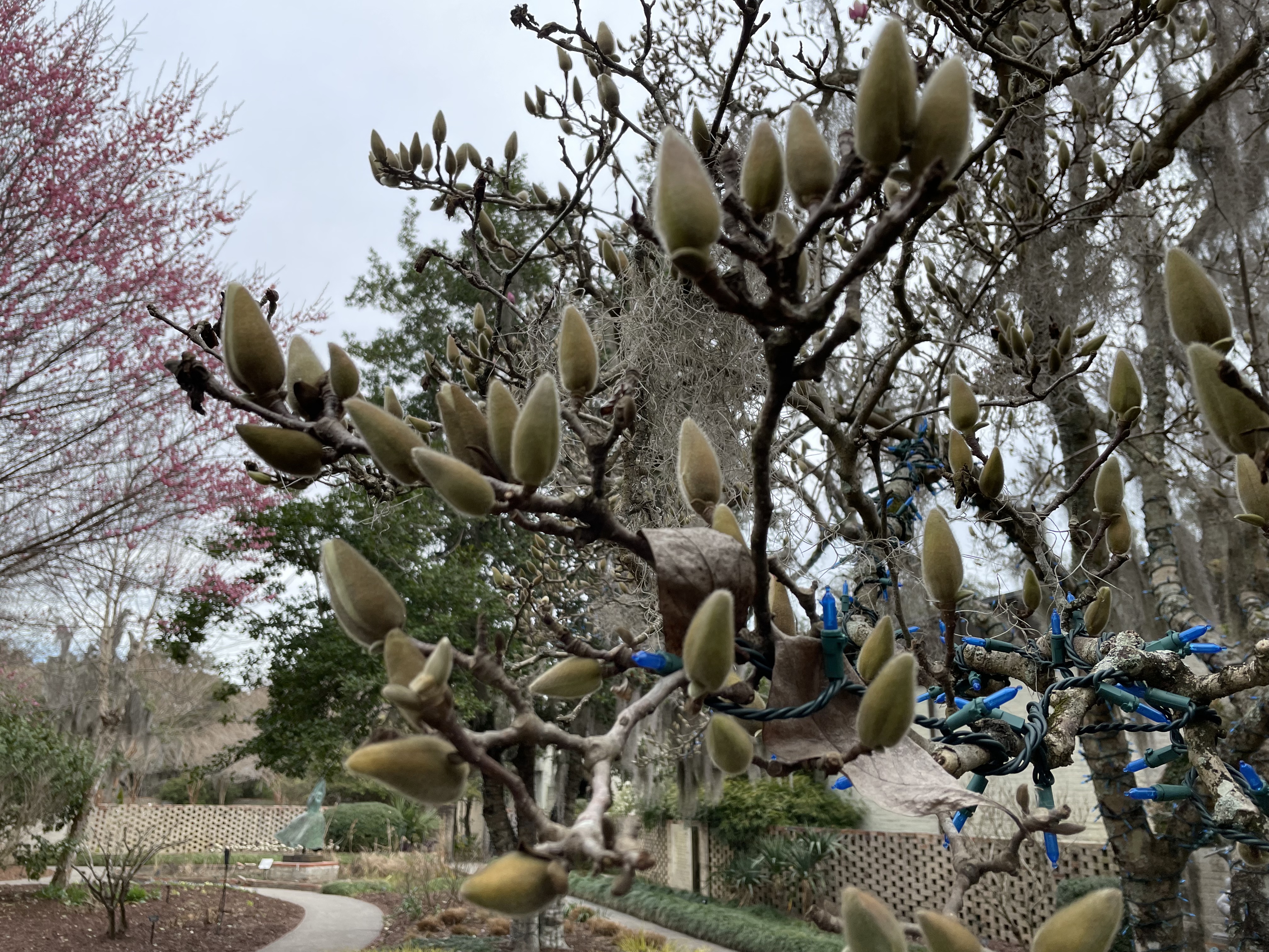 As I began walking I was drawn to the bare branches against the gray skies. There was a “peaceful presence” about these winter trees adorned with their moss, preparing to welcome the new growth of spring soon. The branches were both eery and elegant against the clouded sky. And as I walked on I began to see the signs of new life in the tulip magnolia buds and array of other late winter growth… all of this glory and wonder supported by the deep roots courageously laid down many years ago.
