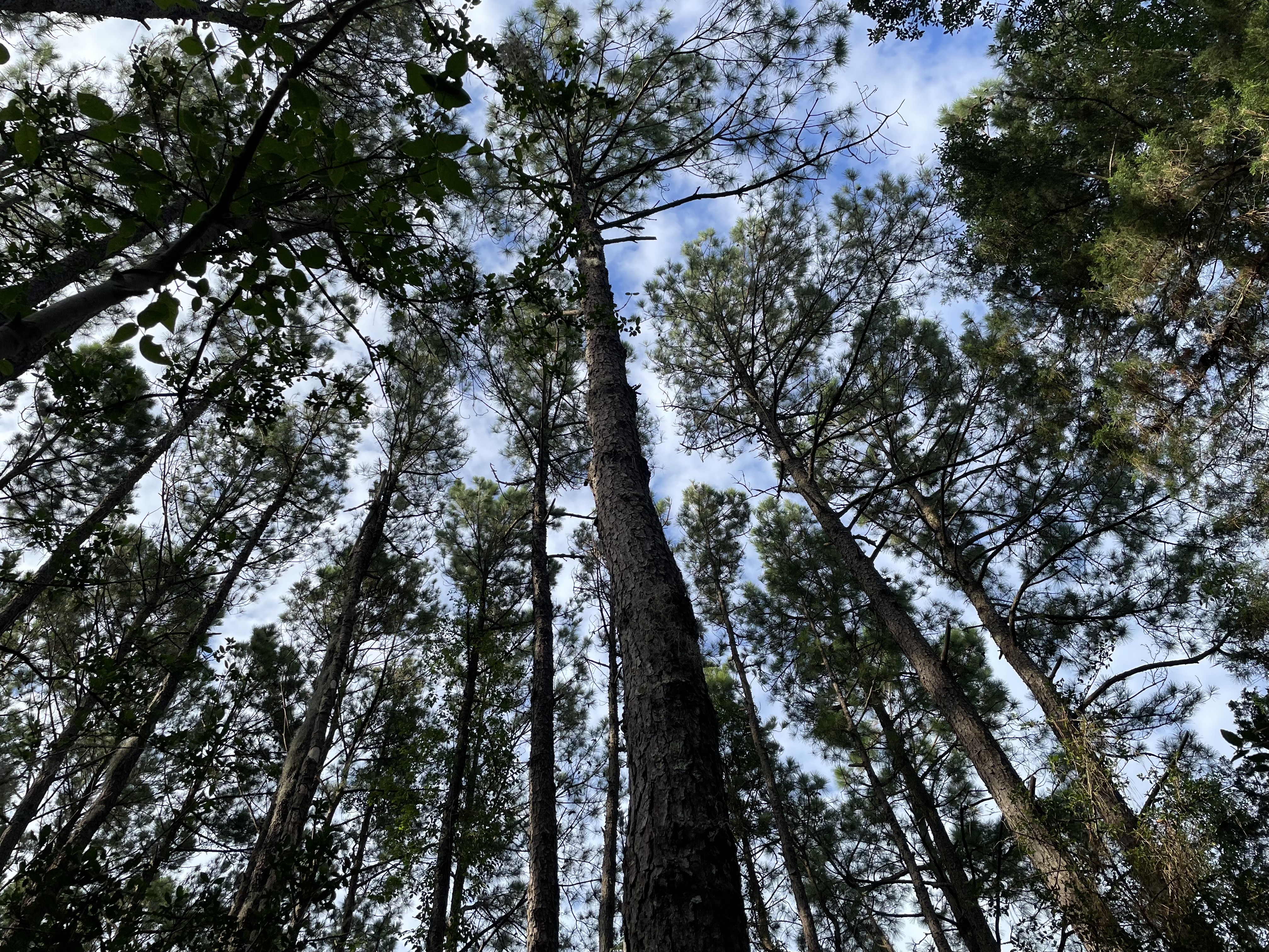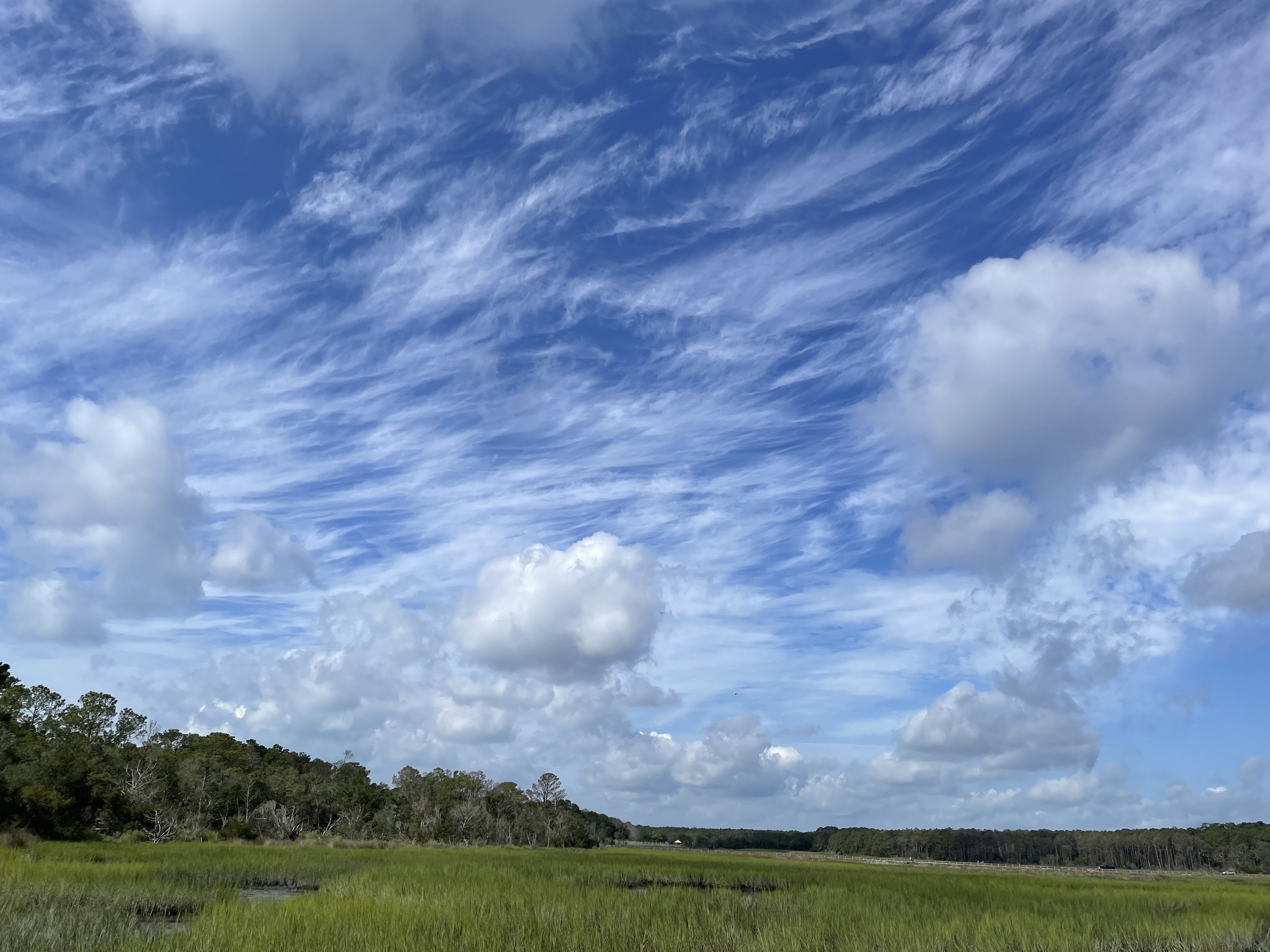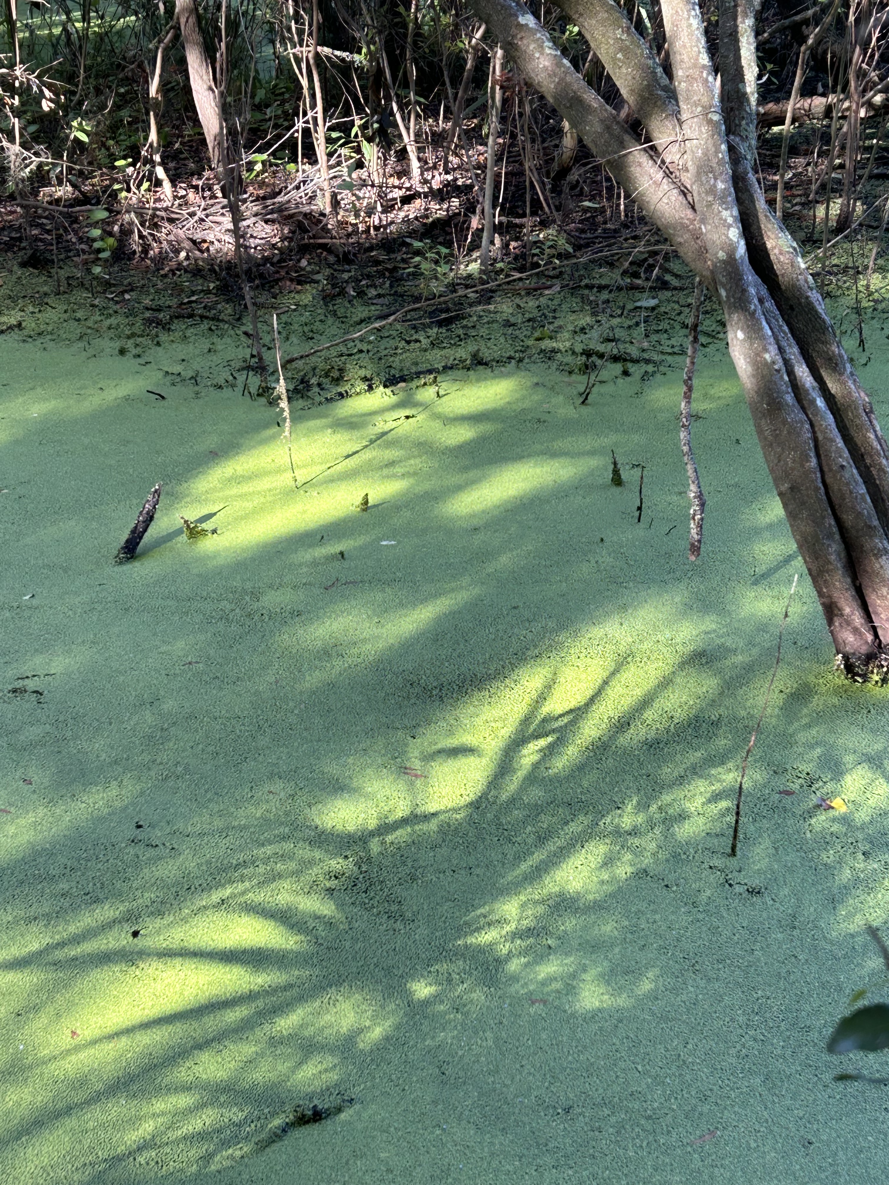 On this already-hot first-thing-in-the-morning walk at the state park, my walking companion and I chose a shady path through the woods that ended at a wooden boardwalk out to a covered dock over the inlet. When we had entered the park, we saw from the causeway a good number of spoonbills, wood storks, egrets at a distance, mirrored in the still water. It was magical. We hoped for a closer look from the dock.