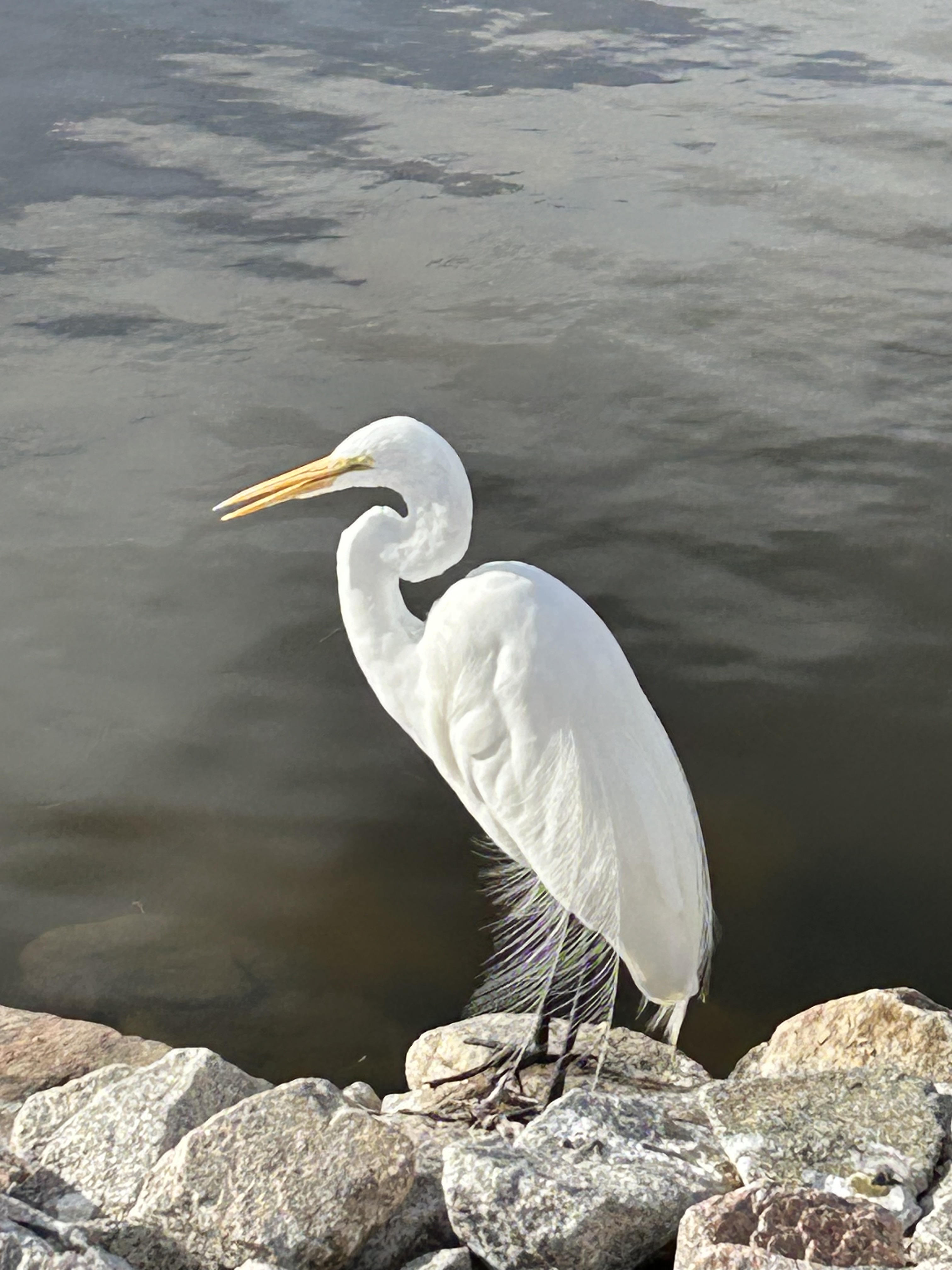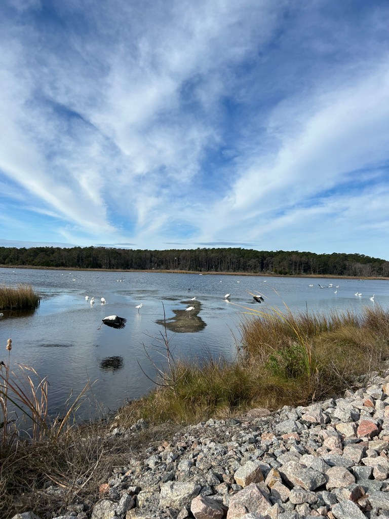 Today’s walk became more a listening to a destination calling me. The waters along the entrance causeway to the park were filled with more varieties of birds than I had ever seen at one time. It was the United Nations of birds: ducks of all kinds, spoonbills, egrets, ibis, heron, gulls, anhingas, swans, even white pelicans! They would float or fly, then settle back into the current that gently rocked them. Or stand on the rocks along the side bank watching, waiting for a spot of lunch. Or just taking in the view themselves—they were part of it, as we were, committing to just being there, together, giving space to one another, drinking in the sun. This was a gift, a healing balm.